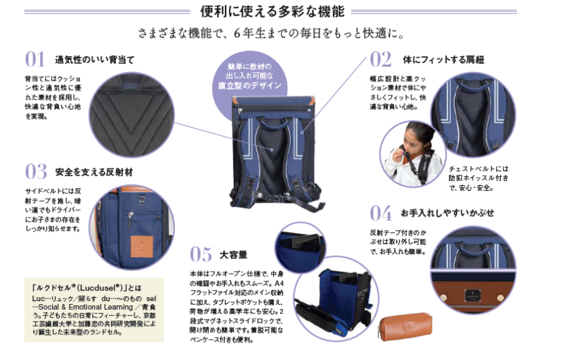 通気性の高い背当てや体にフィットする肩紐、安全性に配慮した反射材など、6年間の毎日を見据えて、細部まで丁寧に設計された「ルクドセル®」。使いやすさと快適さを両立する多彩な機能が、通学はもちろん、学ぶ時間も心地よくサポート。