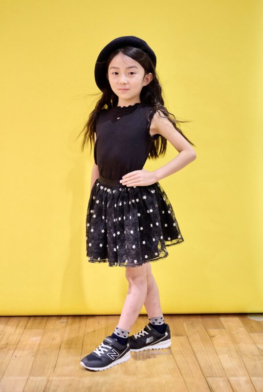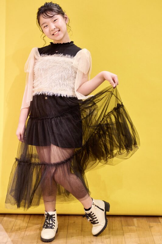 ★なぎささん エアリーでスポーティな黒が主役の着こなしに挑戦してくれたなぎささん。異なる質感の黒をコーディネートで楽しみながら、星やドット、フリルのアクセントが洗練さを添えていますね。