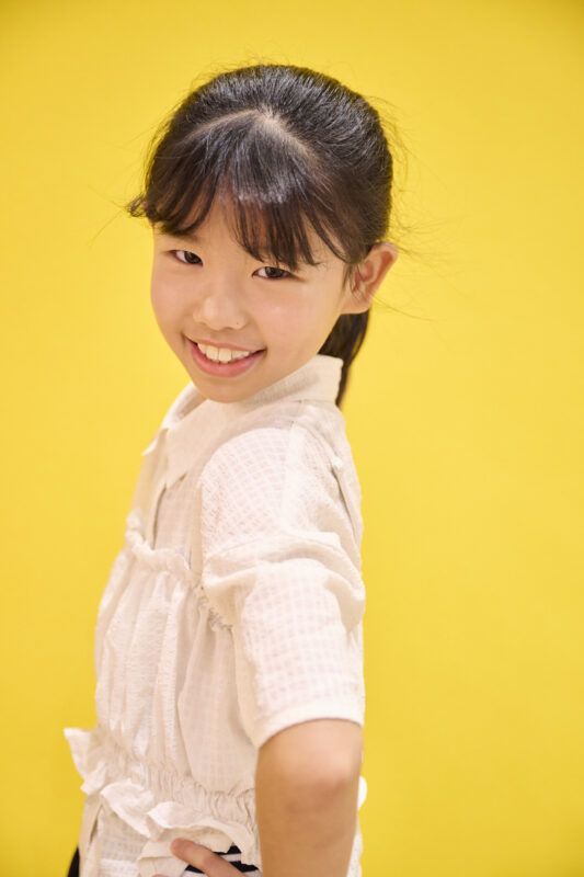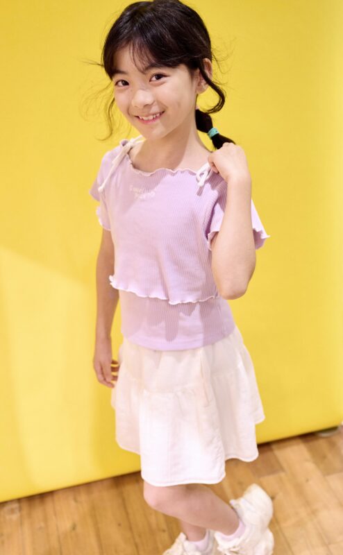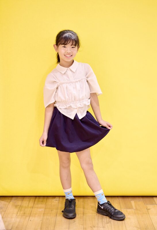 ★羽織さん 女の子らしいデザインのブラウスにネイビーのスカートを合わせて品よくキュートにまとめてくれました。洋服をきれいに見せながら、自信に満ちた表情とポーズがとても印象的です。
