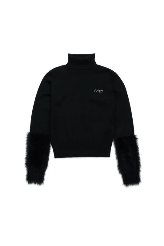 袖口のファーデザインが印象的なタートルニット。シンプルな中に遊び心が光り、ブラックでも軽やかで華のあるスタイルに。