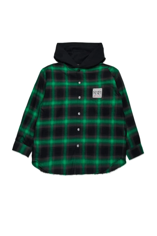 シックなグリーンチェックにフーディを組み合わせた異素材シャツ。1枚でも重ね着でもおしゃれに決まり、カジュアルスタイルをモードに引き締めます。