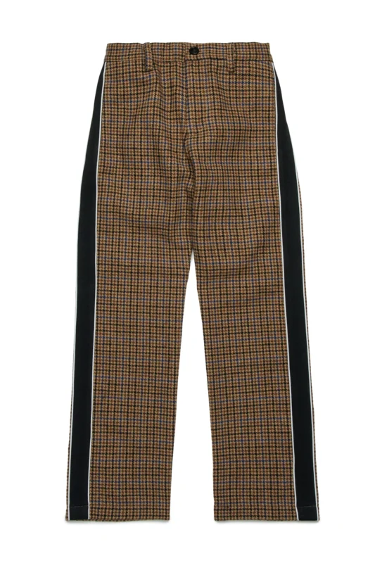 チェック地にブラックのサイドラインを配したパンツ。クラシックな柄をスポーティに仕上げたデザインで、ユニセックスに楽しめる一本です。