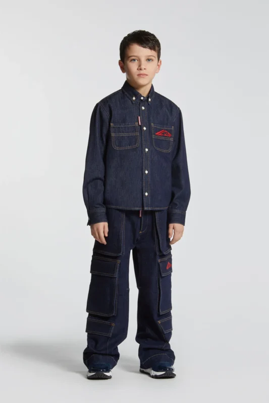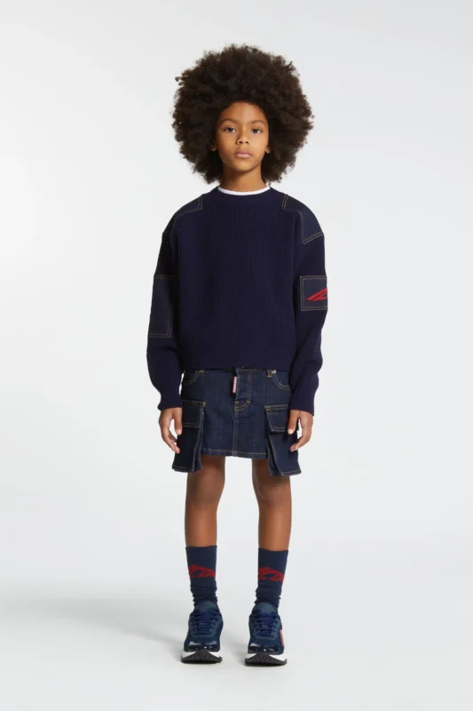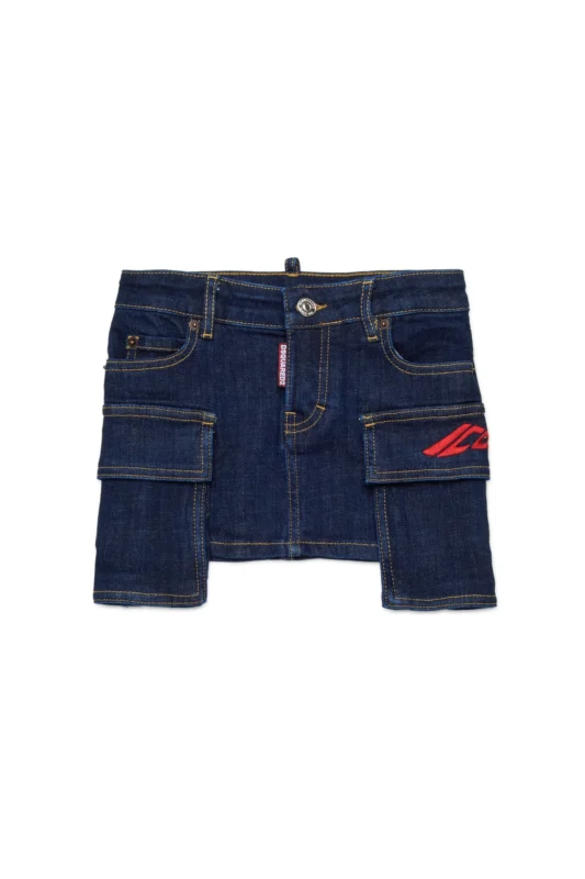 立体ポケットと赤のロゴ刺繍が印象的なデニムスカート。カジュアルな中にも計算されたシルエットで、シーズンレスに活躍してくれます。