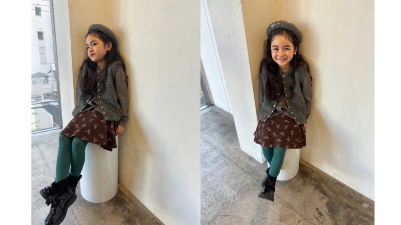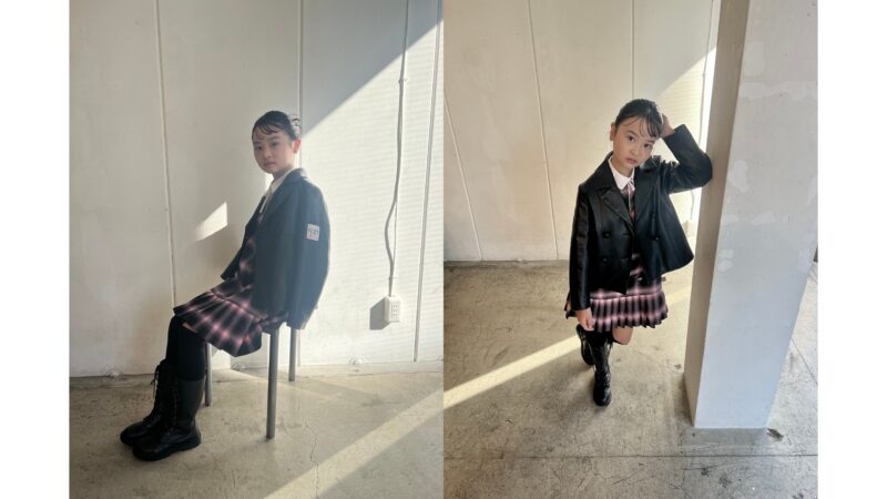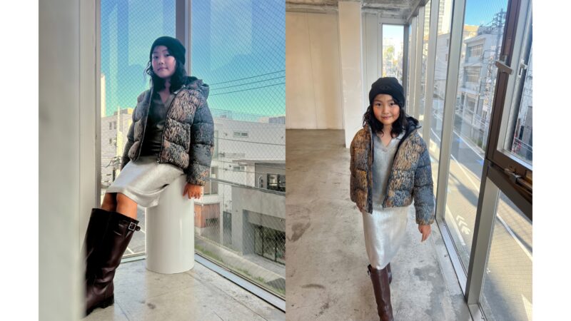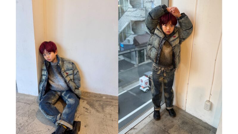 大胆なデニム使いとエッジィなデザインで都会の空気をまとうDIESEL KID。今回は、ダウンジャケットを主役にニットやスカート、ダメージデニムなどを組み合わせ、日常の中に自由なストリート感を描き出しました。カラーヘアやタイトなまとめ髪も、“抜け感のある強さ”をより一層引き立てます。