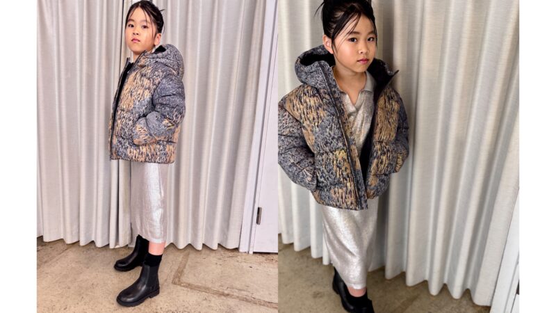 シルバーのグリッターニットワンピに、グラフィカルなダウンを重ねた大人顔負けのバランス。タイトなワンピースにボリューム感あるアウターが旬なバランスを演出。