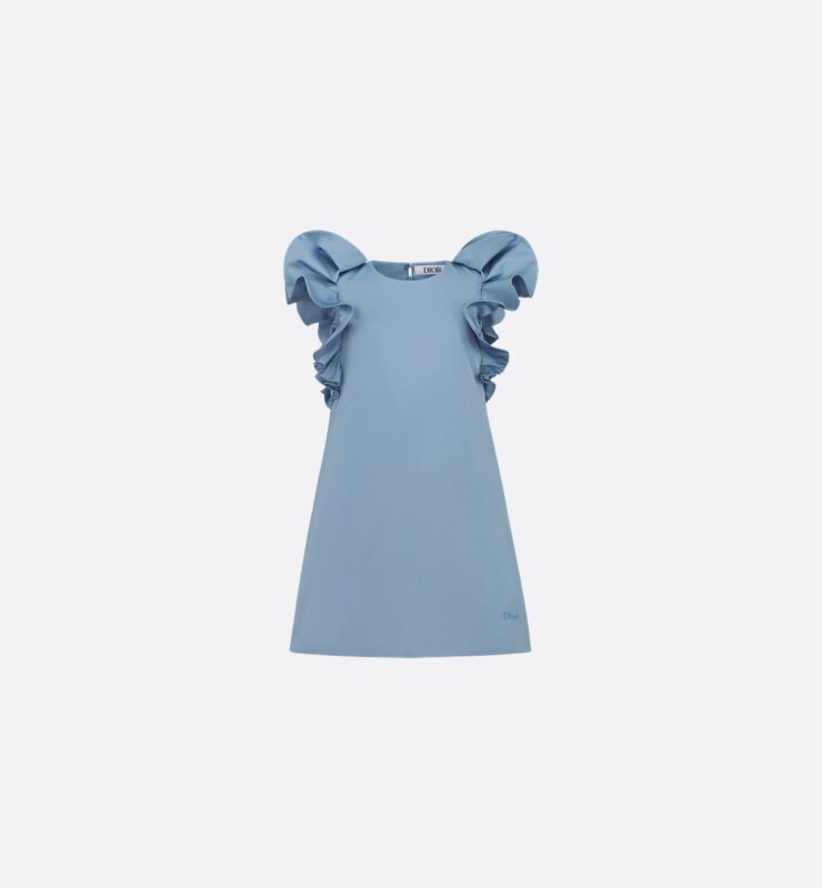構築的なフリルスリーブと、ミニマルなAライン。甘さを抑えたブルーがシルエットの美しさを引き立て、軽やかでいて、どこかモードな雰囲気。