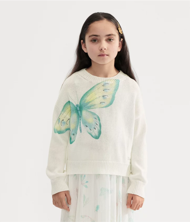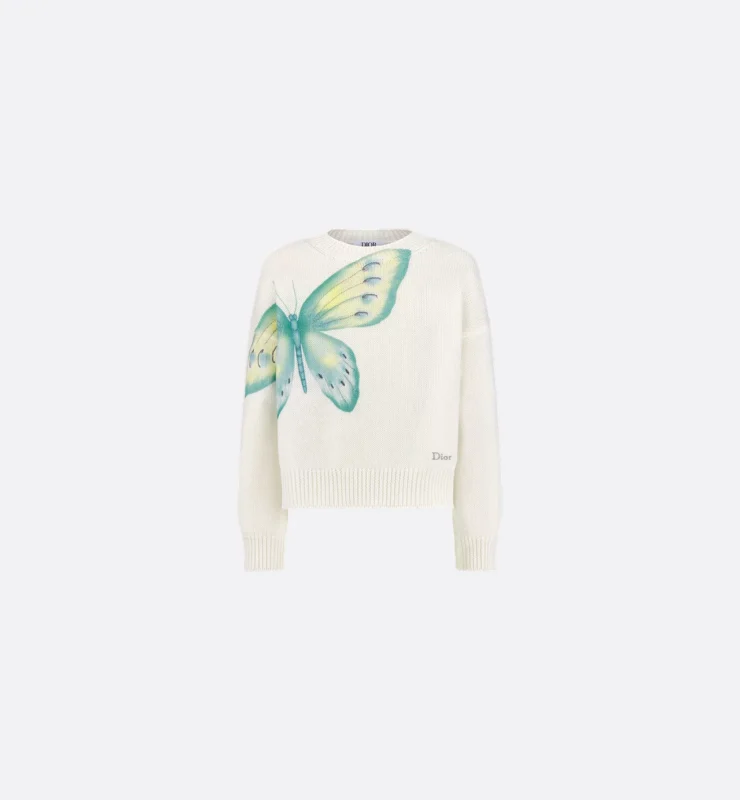 大きく描かれたブルーのバタフライが主役のニット。ミニマルなシルエットに大胆なモチーフを効かせた存在感は、コーディネートのアクセントに。