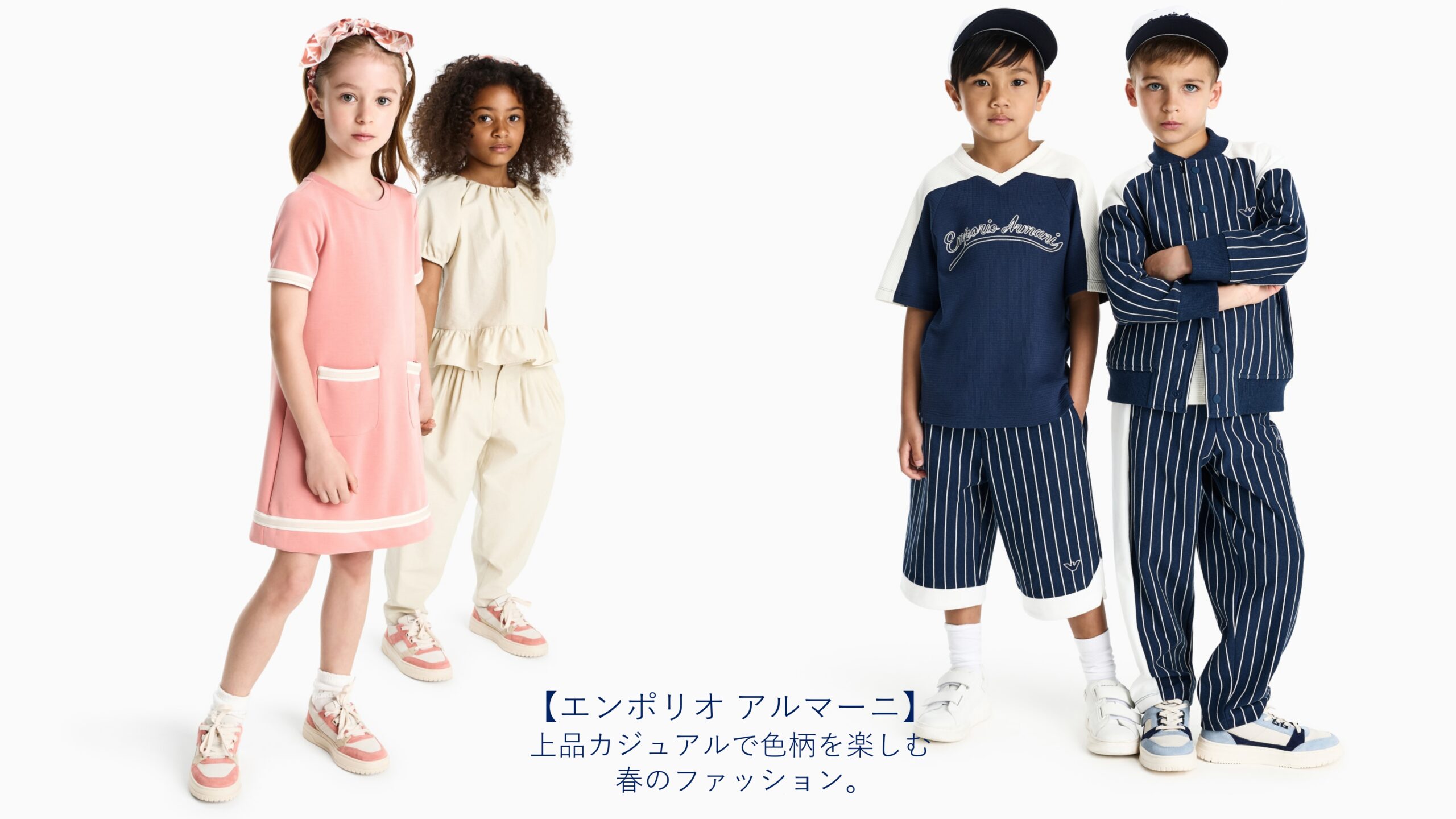 スタイリッシュで洗練されたデザインが魅力の【エンポリオ アルマーニ】。2026年春は、パステルカラーのセットアップやデニム調スタイル、ストライプ柄など、大人顔負けの上品カジュアルが勢ぞろい。この春は、上質感とトレンドをバランスよく取り入れた、ワンランク上のアーバンカジュアルな着こなしを楽しんでみて。
