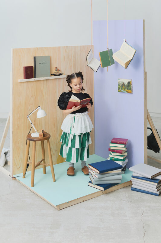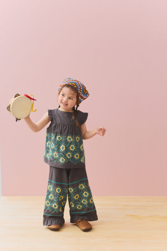 動きに合わせて袖や裾のフリルがふわりと舞う、楽しいスタイリング。