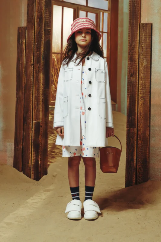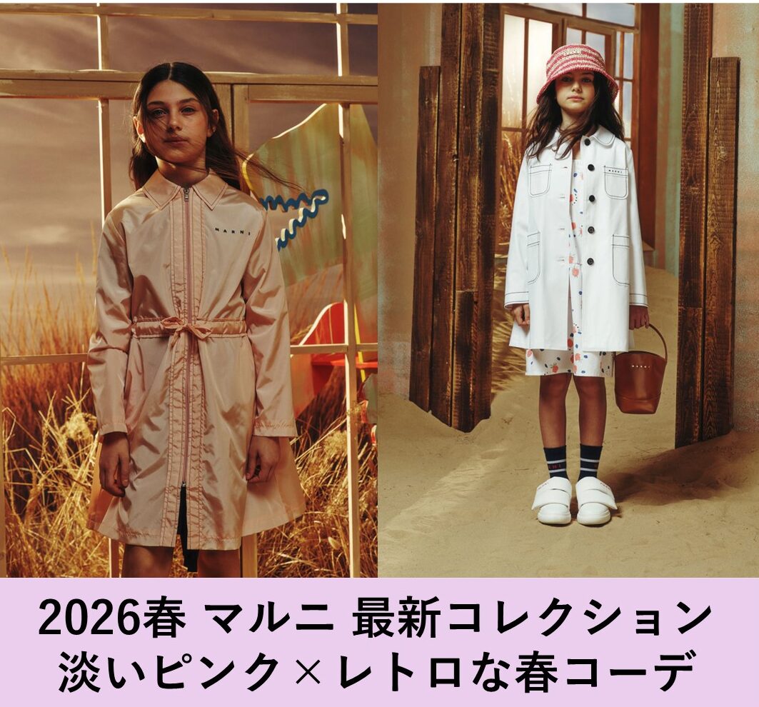 淡いピンクに包まれたスプリングコート、どこか懐かしいシルエットのレトロなアイテムたち。今季のMARNIのキッズアイテムは、やわらかな色彩と遊び心をまといながら、