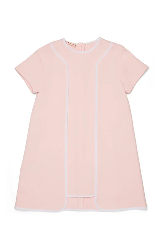 直線的なラインが印象的なミニマルワンピース。くすみピンクに淡いパイピングを効かせ、クラシカルで上品な雰囲気に。