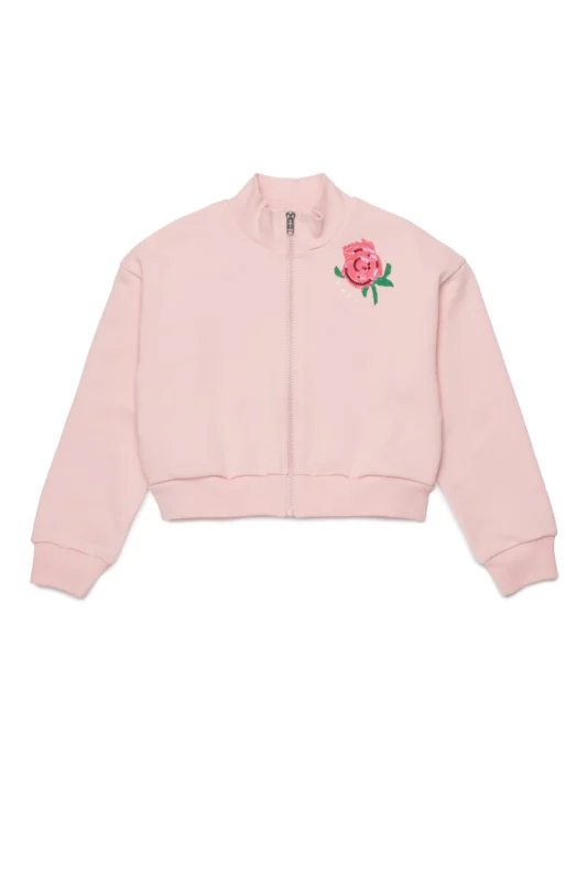 スウェットブルゾンに、胸元のフラワーモチーフがアクセント。スポーティながらも色とディテールで都会的な佇まいに。