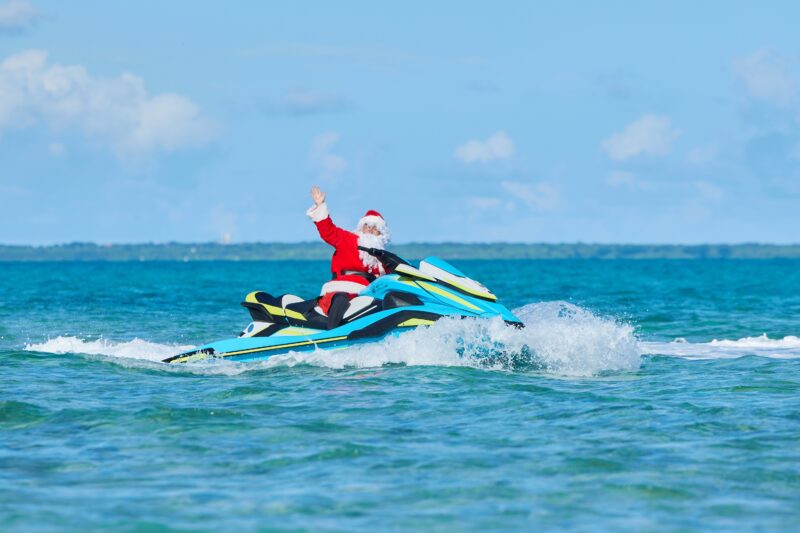 水上オートバイに乗ってプレゼントを届ける「デリバリーサンタ」