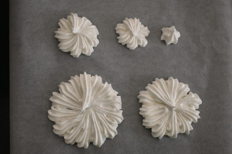 - ボウルに卵白を入れてハンドミキサーで泡立て、白っぽくなったらグラニュー糖を3回に分けて加え硬いメレンゲにする。バニラエッセンスを加え、ゴムベラで混ぜる。星口金をセットした絞り袋に入れる。