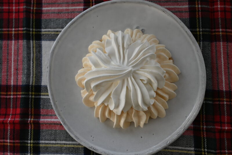 - (ホイップクリームを作る)ボウルに生クリームとソイクリーム、グラニュー糖を入れ、ハンドミキサーで泡立てる。星口金をセットした絞り袋に入れる。