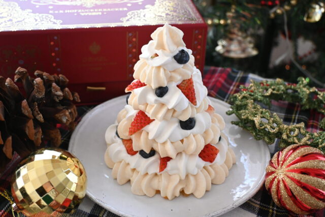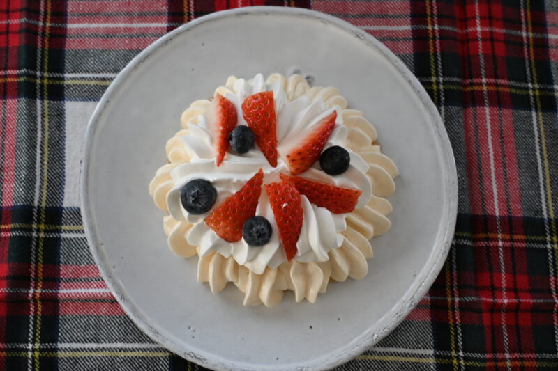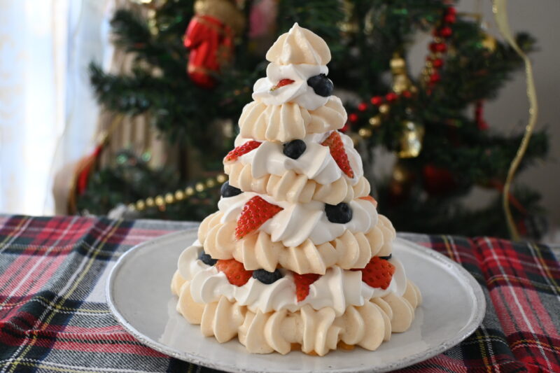 - 3の一番大きなパブロバをお皿にのせ、4を絞る。いちごとブルーベリーを散らし、次に大きなパブロバをのせ同様の工程を繰り返す。ツリーが出来上がる。